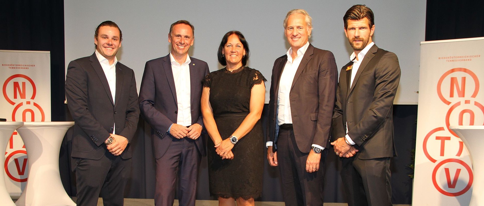 Turnierdirektor Florian Leitgeb, Sportlandesrat Jochen Danninger, NÖTV-Präsidentin Petra Schwarz-Ritter, ÖTV-Präsident Martin Ohneberg, ÖTV-Sportdirektor und Davis-Cup-Kapitän Jürgen Melzer bei der 70-Jahre-Feier des NÖTV und der Auslosung.