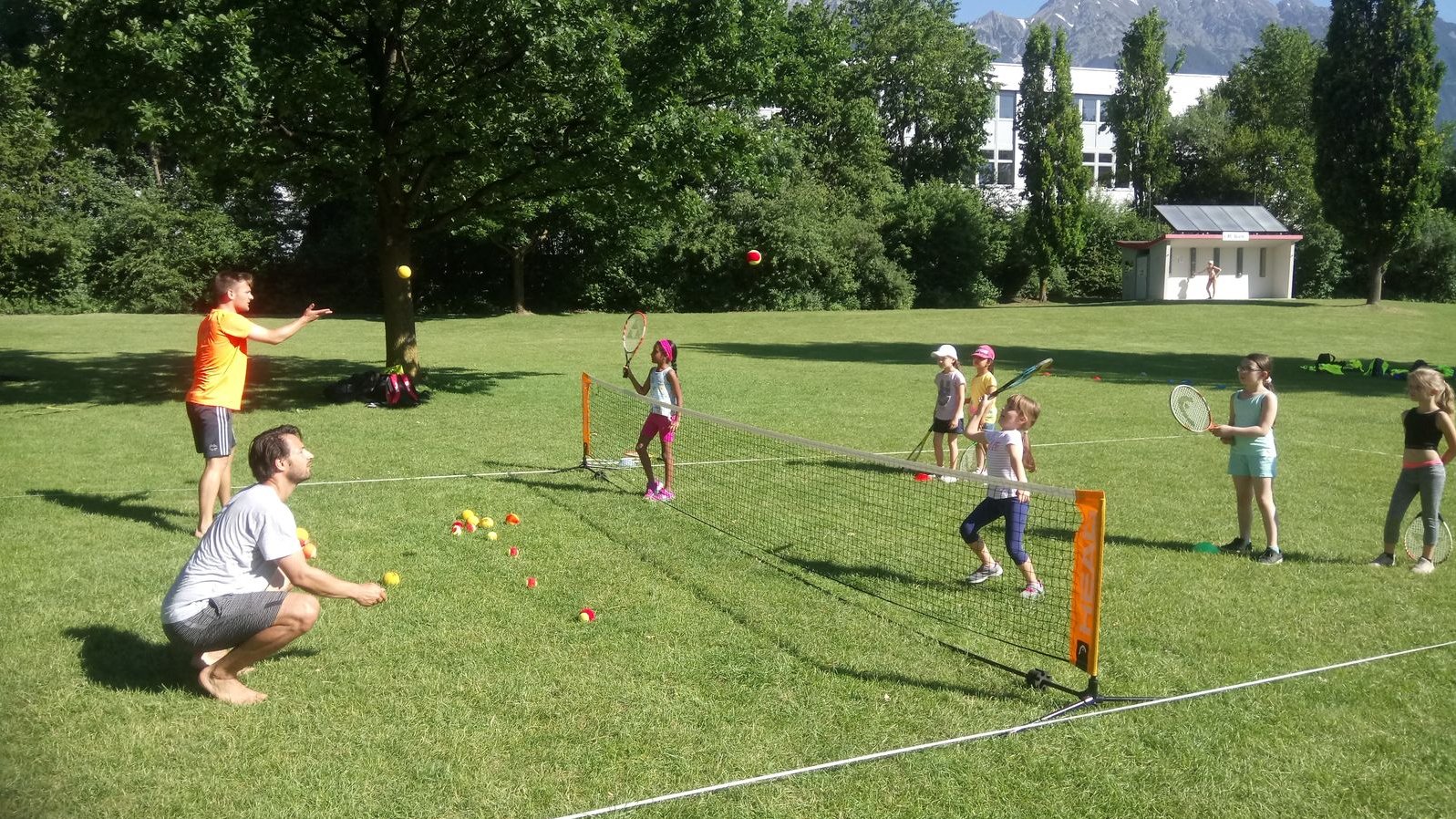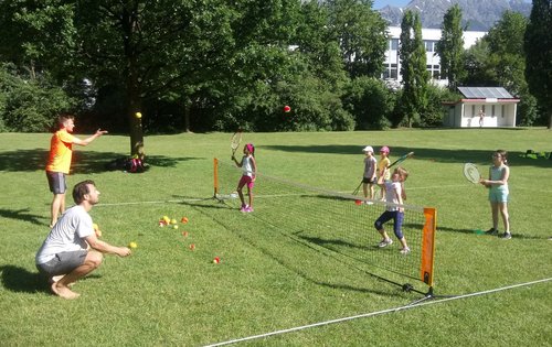Tolles Wetter, 25 motivierte InstruktorInnen in Ausbildung und rund 250 begeisterte Kinder von der Volksschule Neu Arzl. So sah es am Vormittag des 18. Juni am Südufer des Innsbrucker Badesees in der Rossau neben den ersten Badegästen bereits überaus voll aus. Viele der Kids durften zum allerersten Mal zum Tennisracket greifen und einige der "Tennis-Azubis" ebenso zum ersten Mal Kinder in den Tennisgenuss einführen. Inklusive ausgewählter Übungen zum Aufwärmen und diversen Spielen konnten mittels Methodikbällen und 10 Speedtennisnetzen bereits erste Ballwechsel gespielt werden. Bei einigen kreativen Instruktoren waren auch Musik oder Spielkarten dabei - bei allen sichtlich viel Eifer und Begeisterung. Dieses Vorzeigeprojekt gibt es bereits seit 10 Jahren - allen voran Dank Prof. Harald Mair, der das Event in seine Ausbildung aufgenommen hat und von Beginn an unterstützt. Der Erstinitiator dieses "Kick-of Events am Baggersee" war Christian Ostermünchner (tirolaktiv). Übrigens: Im Rahmen der Österreich weiten Aktion "Bewegt im Park" findet jeden Freitag von 16 bis 17 Uhr eine Speed-Tennis-Session statt, die auch betreut ist. Nähere Infos dazu HIER.