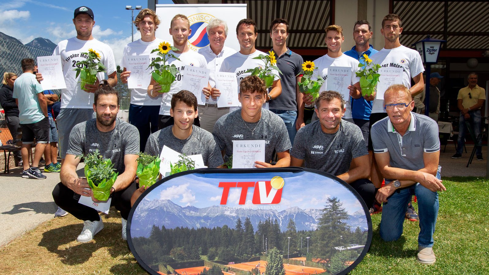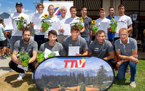 Siegerehrung der Tiroler Mannschaftsmeisterschaft, Tiroler Liga, Allgemeine Klasse - TTV-Präsident Dr. Walter Seidenbusch überreichte persönlich die Preise in Schwaz. Hinten: Das siegreiche Team des TC Raiffeisen Schwaz 1. Vorne: SV Silz 1 und Obmannstellvertreter Ernst Gürtler (TC Schwaz)